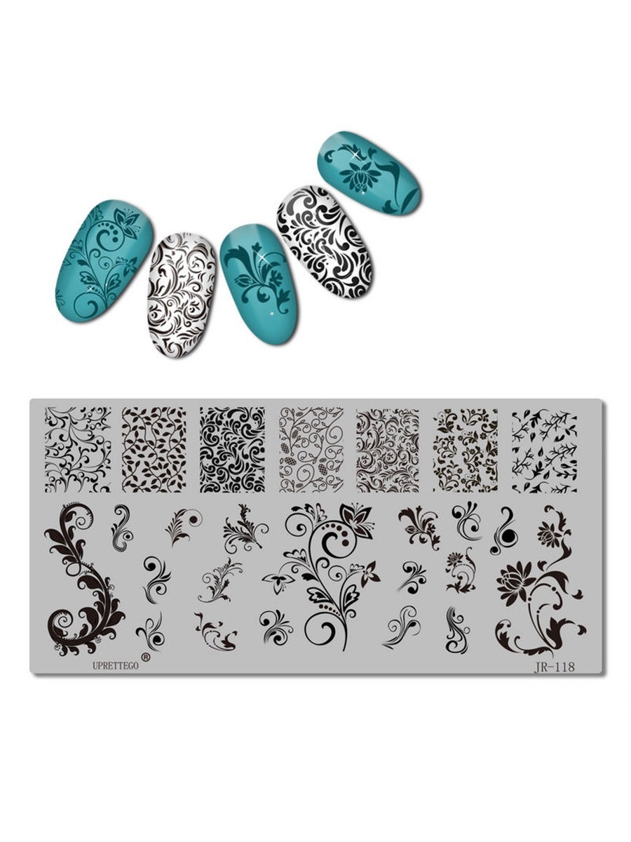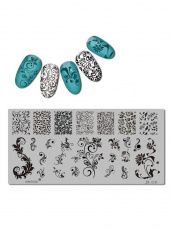 Пластина для стемпинга — это незаменимый трафарет для мастера маникюра при выполнении оригинального дизайна. Переносить изображение можно штампом с помощью гель-лака, простого лака, аэрографа. Пластины изготовлены из черной пленки на клеевой основе с высокоточной плоттерной резкой, что позволяет воспроизводить тончайшие детали на ногтях.
