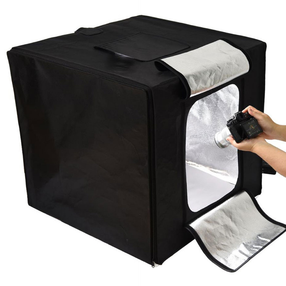 прочный металлический каркас, возможность свободного перемещения светодиодных ламп по направляющим каркаса для изменения светового рисунка и раздельное управления яркостью каждой лампы.Сначала собирается каркас и закрепляются в нужном положении лампы. После этого крепятся тканевые стенки и фон. Фон виниловый: не мнется, не требует разглаживания, легко чистится с помощью влажной ткани. Две светодиодные панели мощностью 20 Вт каждая обеспечивают яркость около 10 000 - 11 000 лм.