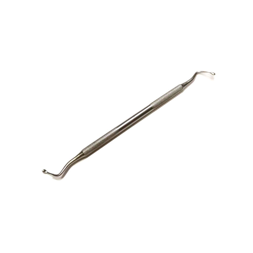 Двухсторонняя педикюрная кюретка — инструмент для профессионального и домашнего использования. С её помощью удаляют омертвевшую кожу под ногтевой пластиной и в боковых ногтевых пазухах. Изогнутая форма рабочей части позволяет работать с вросшими ногтями.