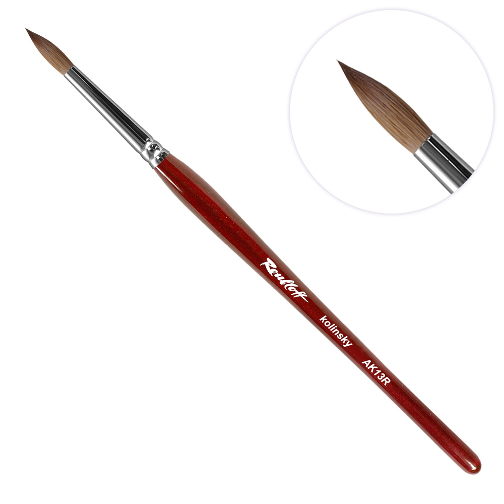 Круглая кисть для ногтей Roubloff AK13R круглой формы создана для моделирования ногтевой пластины. Лучше всего инструмент работает с таким материалом, как акрил (гель или пудра - решать вам). Такая форма кисточки рублёв достаточно быстро формирует материал и позволяет создавать длинную ногтевую пластину. Кисть для акрила позволяет качественно и быстро выравнивать акрил.Материал кисти рублев для маникюра - натуральный волос сибирского колонка ручной обработки. Эта упругая кисть рублеф хорошо удерживает гель при выкладке на ногтевую пластину.