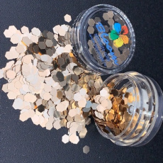 Пайетки в форме шестигранника одного размера. Крупные, золотистые.
