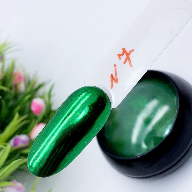 Металлическая втирка супер мелкого помола. Идеально зеркальный блеск после нанесения. На просушенный топ без липкого слоя втереть пальцем или спонжем.