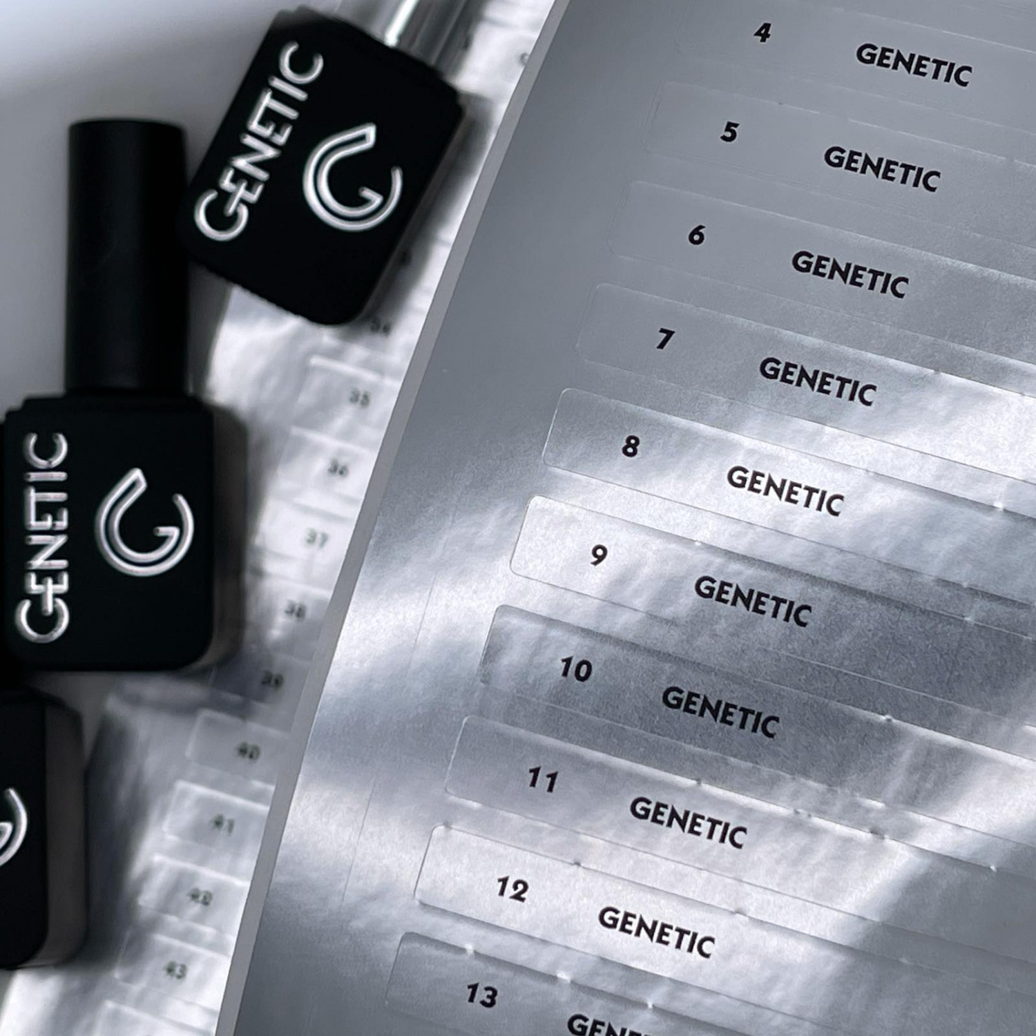Брендированные наклейки для прокрашенных типс Genetic. Имеют стильный дизайн, оснащены номерами гель-лаков. Не отклеиваются, позволяют организовать процесс сортировки оттенков Genetic.